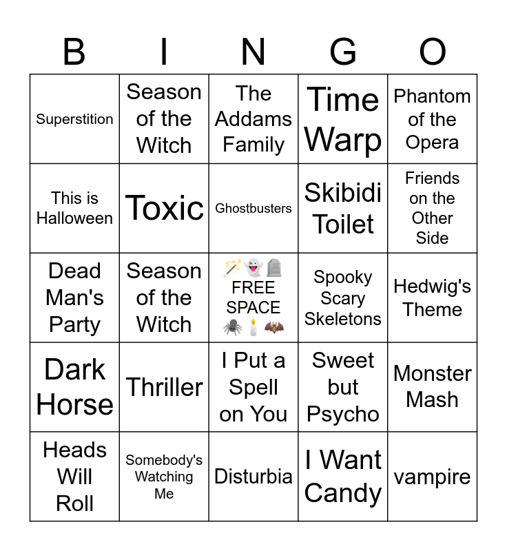This bingo card has a free space and 24 words: Thriller, Somebody's Watching Me, Ghostbusters, Heads Will Roll, Phantom of the Opera, Superstition, This is Halloween, Season of the Witch, Spooky Scary Skeletons, I Put a Spell on You, Skibidi Toilet, Dead Man's Party, Sweet but Psycho, Monster Mash, Toxic, I Want Candy, Hedwig's Theme, The Addams Family, Friends on the Other Side, Season of the Witch, vampire, Dark Horse, Time Warp and Disturbia.