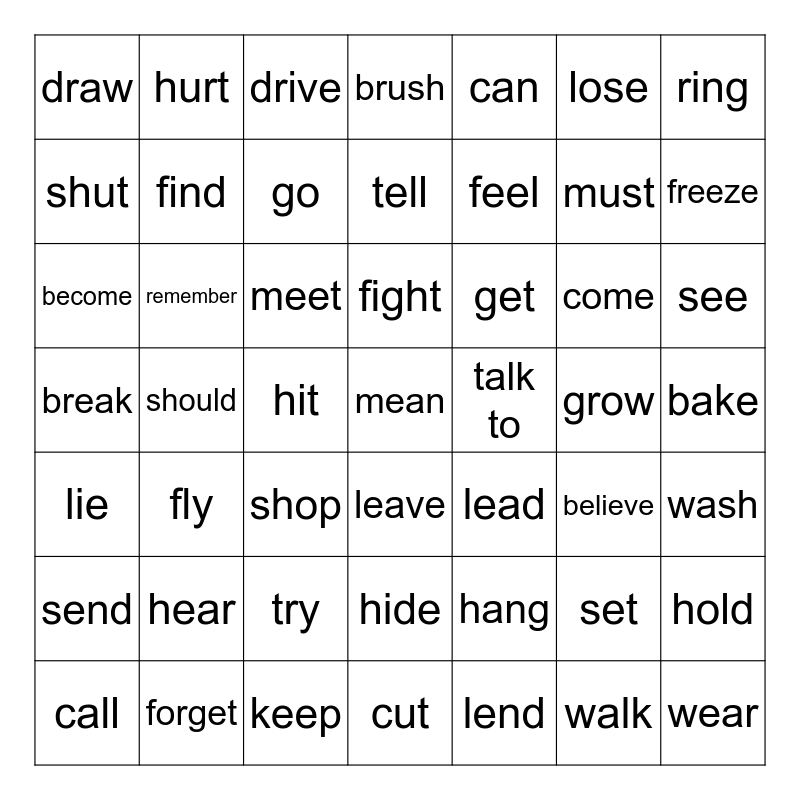 This bingo card has 70 words: ask, become, begin, believe, break, bring, brush, call, can, cheat, come, cut, draw, drive, fall, feel, fight, find, forget, remember, freeze, get, go, grow, fly, hang, hear, hide, hit, hold, hurt, keep, know, lay, lead, leave, lend, let, lie, lose, mean, meet, must, need, put, ring, see, wash, sell, send, set, shine, bake, shop, should, show, shut, stand, take, talk to, tell, think, travel, try, walk, want to, watch, wear, work and write.