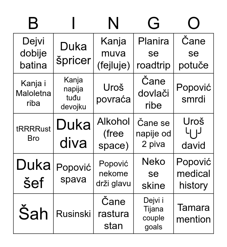 This bingo card has a free space and 24 words: Popović spava, Rusinski, Uroš povraća, Šah, Čane se potuče, Dejvi dobije batina, Kanja i Maloletna riba, Duka špricer, Čane se napije od 2 piva, Popović nekome drži glavu, Čane dovlači ribe, tRRRRust Bro, Neko se skine, Popović medical history, Kanja napija tuđu devojku, Dejvi i Tijana couple goals, Uroš ╰⋃╯ david, Kanja muva (fejluje), Popović smrdi, Duka diva, Tamara mention, Duka šef, Planira se roadtrip and Čane rastura stan.