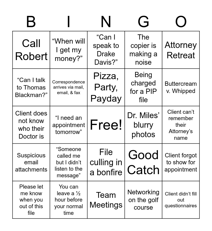 This bingo card has a free space and 24 words: “Someone called me but I didn’t listen to the message”, You can leave a ½ hour before your normal time, Pizza, Party, Payday, Please let me know when you out of this file, Attorney Retreat, Call Robert, “Can I talk to Thomas Blackman?”, “When will I get my money?”, Dr. Miles’ blurry photos, File culling in a bonfire, Being charged for a PIP file, Client does not know who their Doctor is, Good Catch, Client forgot to show for appointment, Correspondence arrives via mail, email, & fax, Networking on the golf course, Client can’t remember their Attorney’s name, “Can I speak to Drake Davis?”, Buttercream v. Whipped, “I need an appointment tomorrow”, Client didn’t fill out questionnaires, Suspicious email attachments, The copier is making a noise and Team Meetings.