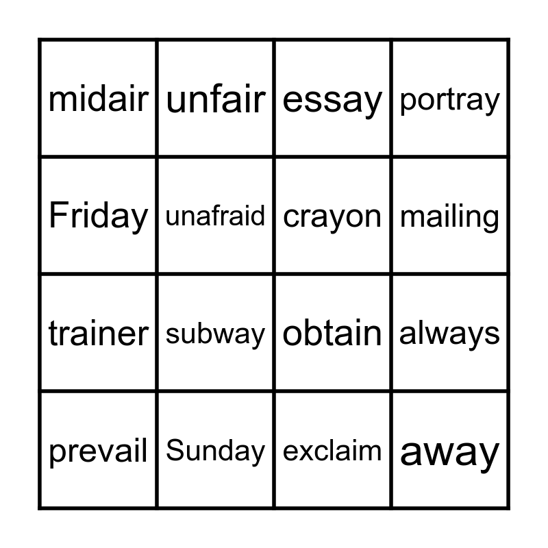 This bingo card has 25 words: explain, affair, mailing, holiday, Friday, midair, unafraid, unfair, Sunday, May, trainer, obtain, railway, display, crayon, complaint, exclaim, essay, subway, always, prevail, complain, away, portray and Monday.