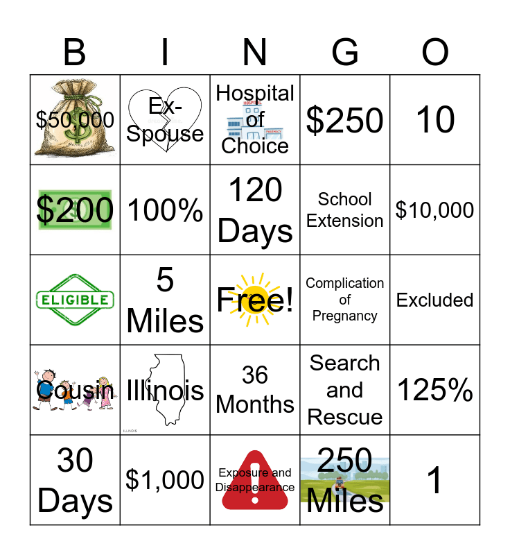 This bingo card has 9 images, a free space and 23 words: 30 Days, Illinois, 120 Days, 250 Miles, 10, $50,000, Ex-Spouse, Hospital of Choice, Complication of Pregnancy, Excluded, 100%, Search and Rescue, 125%, $200, $1,000, Exposure and Disappearance, $250, $10,000, Cousin, 5 Miles, 36 Months, School Extension and 1.