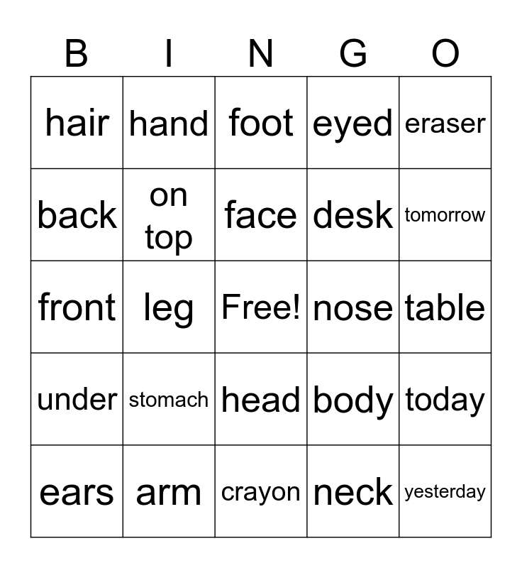 This bingo card has a free space and 24 words: ears, stomach, face, neck, eraser, hair, hand, foot, nose, table, front, on top, body, today, back, arm, crayon, eyed, tomorrow, under, leg, head, desk and yesterday.