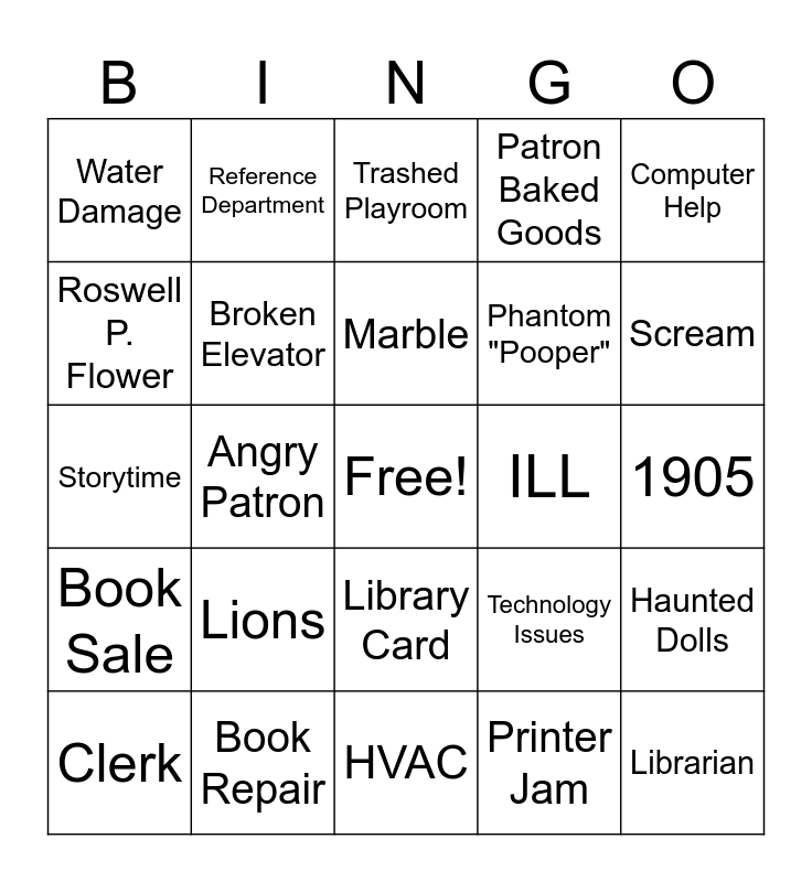 This bingo card has a free space and 24 words: Lions, Book Repair, Marble, Clerk, Computer Help, Water Damage, Roswell P. Flower, Reference Department, ILL, Library Card, Phantom "Pooper", Storytime, Technology Issues, Haunted Dolls, Broken Elevator, Printer Jam, 1905, Trashed Playroom, Scream, Angry Patron, Librarian, Book Sale, Patron Baked Goods and HVAC.