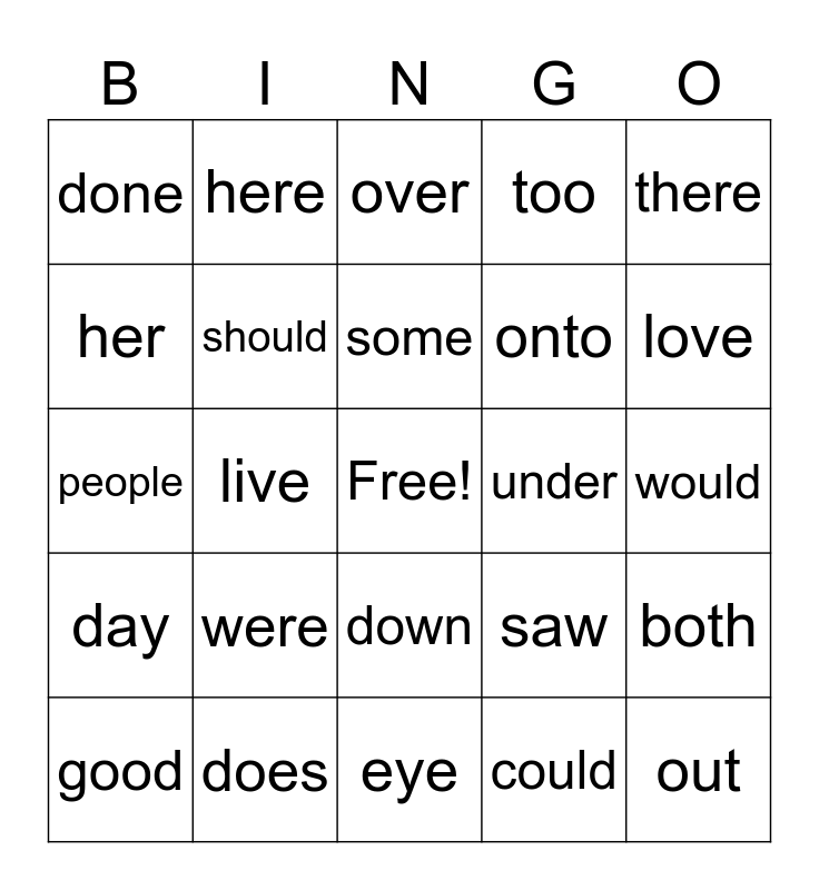 This bingo card has a free space and 24 words: were, does, some, good, there, done, her, here, under, down, onto, people, saw, both, should, could, would, over, love, live, out, day, too and eye.