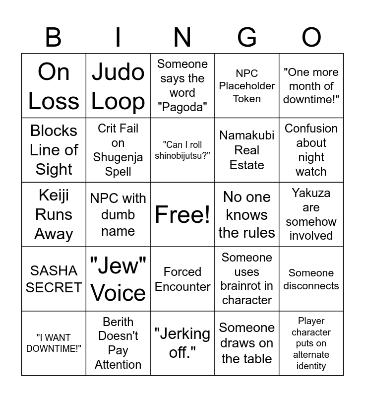 This bingo card has a free space and 24 words: "Jew" Voice, Berith Doesn't Pay Attention, "Can I roll shinobijutsu?", "I WANT DOWNTIME!", "One more month of downtime!", On Loss, Blocks Line of Sight, Judo Loop, No one knows the rules, Forced Encounter, Namakubi Real Estate, Keiji Runs Away, Someone uses brainrot in character, Someone disconnects, Crit Fail on Shugenja Spell, Someone draws on the table, Yakuza are somehow involved, Someone says the word "Pagoda", Confusion about night watch, NPC with dumb name, Player character puts on alternate identity, SASHA SECRET, NPC Placeholder Token and "Jerking off.".