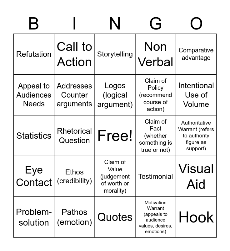 This bingo card has a free space and 24 words: Ethos (credibility), Pathos (emotion), Logos (logical argument), Problem-solution, Comparative advantage, Refutation, Appeal to Audiences Needs, Call to Action, Claim of Fact (whether something is true or not), Claim of Value (judgement of worth or morality), Claim of Policy (recommend course of action), Statistics, Testimonial, Visual Aid, Addresses Counter arguments, Motivation Warrant (appeals to audience values, desires, emotions), Authoritative Warrant (refers to authority figure as support), Storytelling, Intentional Use of Volume, Rhetorical Question, Hook, Eye Contact, Non Verbal and Quotes.