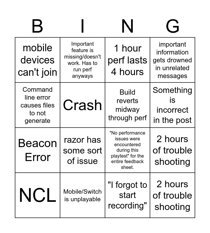 This bingo card has 17 words: "I forgot to start recording", NCL, 1 hour perf lasts 4 hours, mobile devices can't join, razor has some sort of issue, important information gets drowned in unrelated messages, 2 hours of trouble shooting, Build reverts midway through perf, Something is incorrect in the post, Crash, Mobile/Switch is unplayable, "No performance issues were encountered during this playtest" for the entire feedback sheet., Command line error causes files to not generate, Important feature is missing/doesn't work. Has to run perf anyways, Beacon Error, Perf gets randomly cancelled and 2 hours of trouble shooting.
