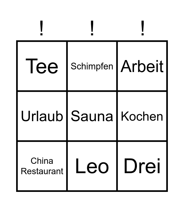This bingo card has 10 words: Leo, Arbeit, Tee, Sauna, Urlaub, China Restaurant, Schimpfen, Tanzen, Kochen and Drei.