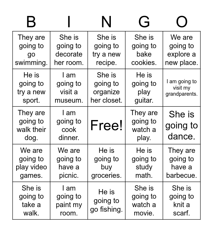 This bingo card has a free space and 46 words: I am going to ride a bike., She is going to knit a scarf., They are going to play board games., He is going to go fishing., We are going to have a picnic., I am going to learn to play chess., She is going to decorate her room., They are going to take photos., He is going to try a new sport., We are going to do yoga., I am going to visit a museum., She is going to bake cookies., They are going to have a barbecue., He is going to study math., We are going to play with the dog., I am going to learn to sing., She is going to organize her closet., They are going to watch a play., He is going to make a scrapbook., We are going to explore a new place., I am going to cook dinner., She is going to watch a movie., They are going to go swimming., He is going to play guitar., We are going to clean the house., I am going to visit my grandparents., She is going to take a walk., They are going to study English., He is going to buy groceries., We are going to play video games., I am going to read a new book., She is going to call her friend., They are going to plant flowers., He is going to make pasta., We are going to go hiking., I am going to paint my room., She is going to dance., They are going to exercise., He is going to write a letter., We are going to play basketball., I am going to learn a new language., She is going to try a new recipe., They are going to walk their dog., He is going to organize his room., We are going to attend a concert. and I am going to go to the park..