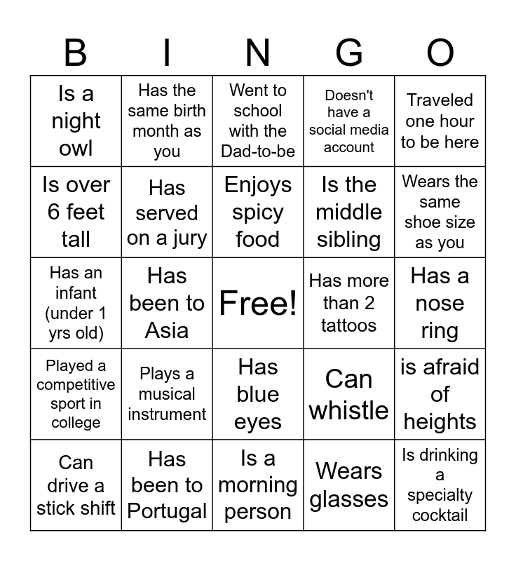 This bingo card has a free space and 102 words: Is related to the Mom-to-be, Is related to the Dad-to-be, Traveled one hour to be here, Lives under 15 minutes away, Has a pet dog, Has a pet cat, Has 2 or more pets, Has a pet (not a cat or dog), Has been married 10+ years, Has been married for less than 5 years, Has 3 or more children, Has no more than one child, Is the youngest person here, Is the oldest person here, Is a vegetarian, Is a vegan, Played a competitive sport in college, Is wearing something brown, Is wearing something black, Is wearing something red, Is wearing something orange, Is wearing something blue, Has met someone famous, Doesn't drink coffee, Drinks tea instead of coffee, Wears the same shoe size as you, Doesn't have a social media account, Plays a musical instrument, Is an only child, Knows more than 2 languages, Has the same birth month as you, Went to school with the Dad-to-be, Went to school with the Mom-to-be, Is left-handed, Has a Master's degree, Has blue eyes, Has green eyes, Is the same age as you, Has an infant (under 1 yrs old), Wears glasses, Loves reality TV, Likes classical music, Can drive a stick shift, Has moved in the last year, Is an Aquarius, Is a Taurus, Is a Capricorn, Is the middle sibling, Is the oldest sibling, Is the youngest sibling, Has a younger sister, Has an older brother, Is over 6 feet tall, Is shorter than you, Name starts with the same letter as yours, Has curly hair, Has no hair, Is drinking red wine, Is drinking white wine, Is drinking a specialty cocktail, Works in a school, Works in finance, Favorite season is Spring, Loves garlic, Plays the piano, Was born in another country, Has a toddler (1.5-3 yrs old), Has a nose ring, Has been to Asia, Has been to Portugal, Has lived in another country, Has lived in Australia, Doesn't drink alcohol, Has a teenager (13-18 yrs old), Loves sushi, Has an Android phone, Has served on a jury, Has worked in a restaurant, Has taken a cruise, Has been skydiving, Likes country music, Likes classical music, Has a tattoo, Has more than 2 tattoos, Has read all the Harry Potter books, Enjoys spicy food, Has lived in California, Enjoys hiking, Works with the Mom-to-be, Works with the Dad-to-be, Can juggle, Can whistle, Has never used Tik Tok, Has run a marathon, Went to a concert in the past 3 months, Is a morning person, Is a night owl, Has moved within the last 1 year, is afraid of heights, Has never been on an airplane, Favorite season is Spring and Favorite season is Winter.