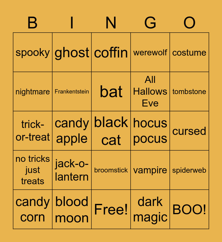 This bingo card has 25 words: jack-o-lantern, Free!, bat, candy corn, costume, spooky, nightmare, ghost, hocus pocus, broomstick, All Hallows Eve, trick-or-treat, vampire, spiderweb, Frankentstein, BOO!, cursed, coffin, tombstone, candy apple, black cat, blood moon, no tricks just treats, werewolf and dark magic.