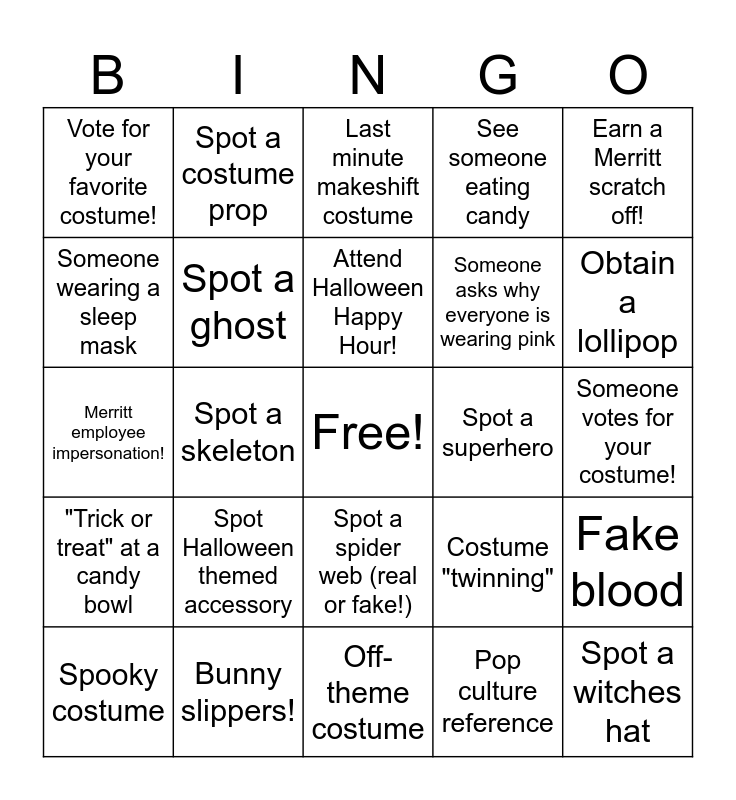 This bingo card has a free space and 27 words: Costume "twinning", See collaborative costumes, Someone asks why everyone is wearing pink, Off-theme costume, Someone wearing a sleep mask, Last minute makeshift costume, Spot a costume prop, "Trick or treat" at a candy bowl, Spot a superhero, Fake blood, Merritt employee impersonation!, See someone eating candy, Spooky costume, Bunny slippers!, Obtain a lollipop, See a decorated workspace, Spot a ghost, Attend Halloween Happy Hour!, Spot Halloween themed accessory, Vote for your favorite costume!, Someone votes for your costume!, Pop culture reference, Spot a skeleton, Spot a witches hat, Spot a spider web (real or fake!), Earn a Merritt scratch off! and Find a stress ball (and report it to Lexi!).