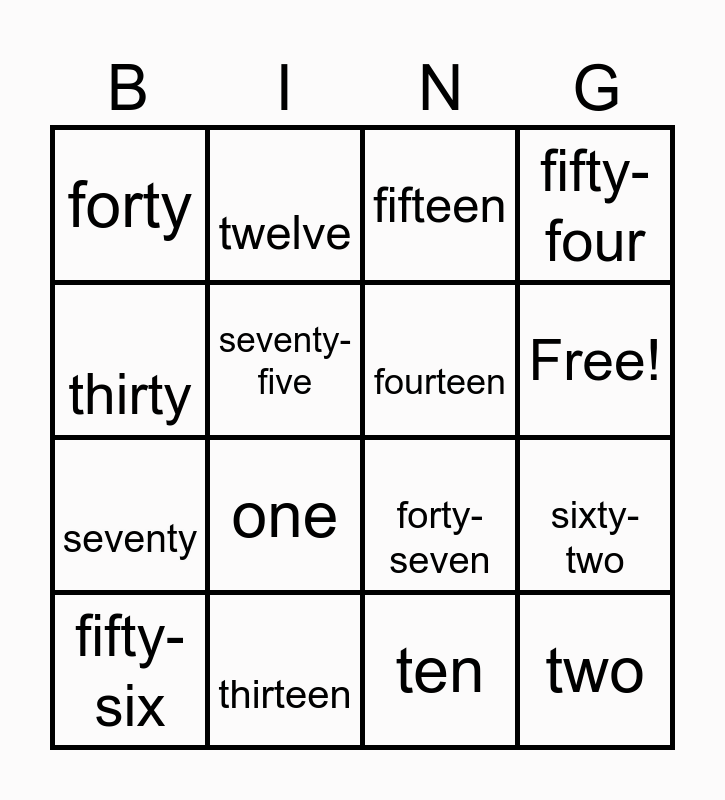 This bingo card has 17 words: ten, fifty-six, fifteen, forty, one, fifty-four, sixty-two, fourteen, Free!, seventy-five, thirteen, forty-seven, thirty, twelve, seventy, fifty and two.