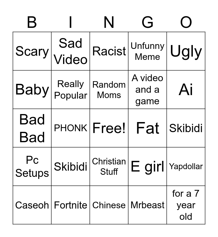 This bingo card has a free space and 24 words: Skibidi, Fortnite, Random Moms, Caseoh, Ugly, Scary, Baby, Sad Video, Fat, Christian Stuff, A video and a game, Bad Bad, E girl, Yapdollar, Really Popular, Mrbeast, Skibidi, Racist, Ai, PHONK, for a 7 year old, Pc Setups, Unfunny Meme and Chinese.