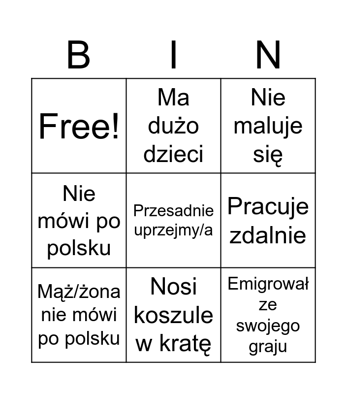 This bingo card has 9 words: Mąż/żona nie mówi po polsku, Nie maluje się, Ma dużo dzieci, Nie mówi po polsku, Free!, Pracuje zdalnie, Przesadnie uprzejmy/a, Emigrował ze swojego graju and Nosi koszule w kratę.