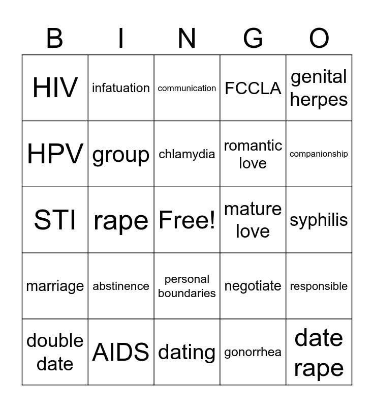This bingo card has a free space and 24 words: abstinence, AIDS, chlamydia, double date, genital herpes, HIV, HPV, infatuation, mature love, personal boundaries, romantic love, STI, negotiate, responsible, group, gonorrhea, syphilis, communication, companionship, rape, date rape, marriage, FCCLA and dating.