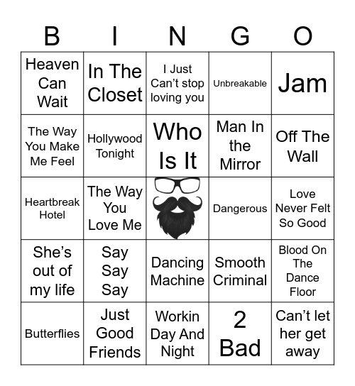 This bingo card has a free space and 27 words: Smooth Criminal, Rock With You, Man In the Mirror, Workin Day And Night, The Way You Make Me Feel, I Just Can’t stop loving you, In The Closet, She’s out of my life, Dangerous, Blood On The Dance Floor, Heartbreak Hotel, Unbreakable, Butterflies, Just Good Friends, Off The Wall, Girlfriend, Hollywood Tonight, Who Is It, Say Say Say, Heaven Can Wait, Love Never Felt So Good, 2 Bad, The Way You Love Me, Can’t let her get away, Dancing Machine, Jam and She Drives Me Wild.