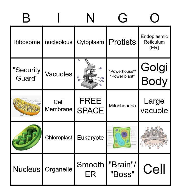 This bingo card has 7 images, a free space and 22 words: Nucleus, Cell Wall, Cell Membrane, Lysosome, Ribosome, Cytoplasm, Vacuoles, Chloroplast, Mitochondria, Organelle, Large vacuole, Cell, Smooth ER, "Brain"/ "Boss", Golgi Body, Prokaryote, Eukaryote, Endoplasmic Reticulum (ER), "Powerhouse"/ "Power plant", "Security Guard", Protists and nucleolous.