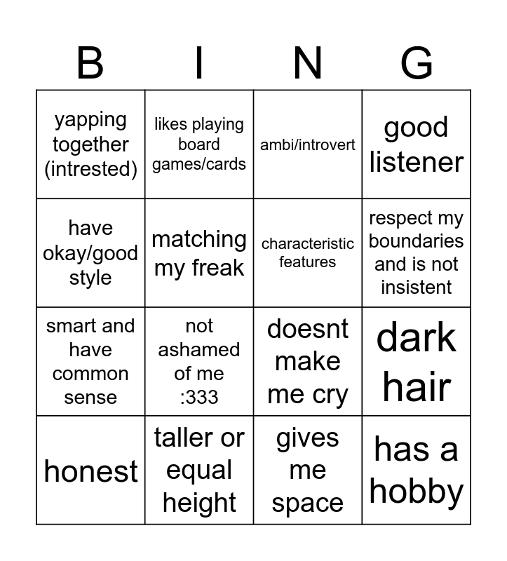 This bingo card has 16 words: taller or equal height, dark hair, ambi/introvert, yapping together (intrested), smart and have common sense, likes playing board games/cards, doesnt make me cry, gives me space, have okay/good style, matching my freak, honest, good listener, not ashamed of me :333, respect my boundaries and is not insistent, characteristic features and has a hobby.