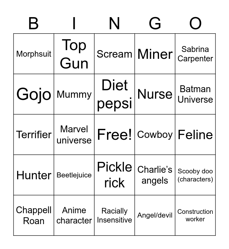 This bingo card has a free space and 24 words: Beetlejuice, Anime character, Diet pepsi, Chappell Roan, Sabrina Carpenter, Morphsuit, Gojo, Top Gun, Cowboy, Pickle rick, Nurse, Terrifier, Charlie’s angels, Scooby doo (characters), Mummy, Angel/devil, Feline, Scream, Batman Universe, Marvel universe, Construction worker, Hunter, Miner and Racially Insensitive.