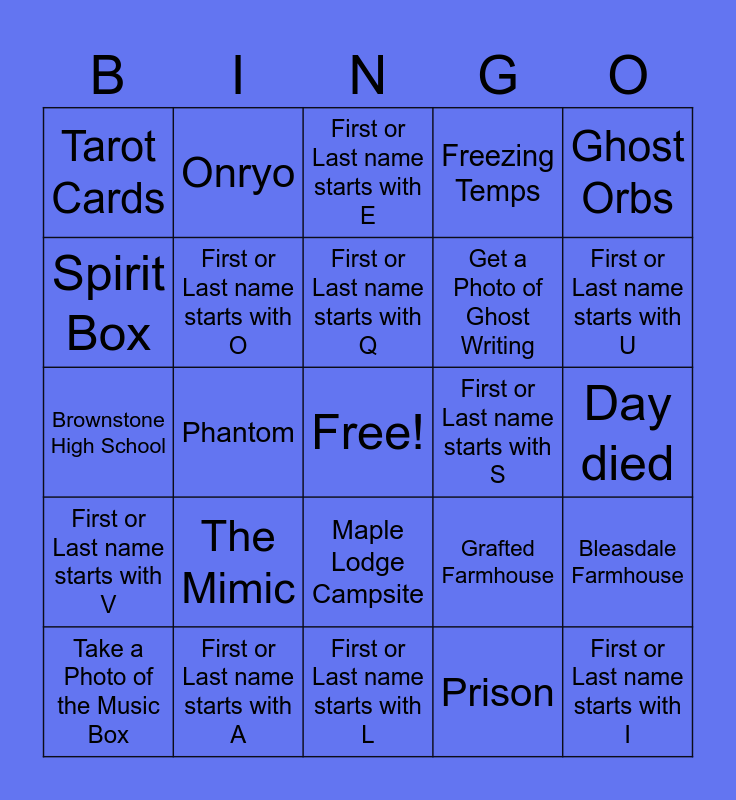 This bingo card has a free space and 108 words: Spirit, Wraith, Phantom, Poltergeist, Banshee, Jinn, Mare, Revenant, Shade, Demon, Yurei, Oni, Yokai, Hantu, Goryo, Myling, Onryo, The Twins, Raiju, Obake, The Mimic, Moroi, Deogen, Thaye, EMF 5, Ghost Orbs, Spirit Box, Freezing Temps, Ultraviolet, Ghost Writing, D.O.T.S., First or Last name starts with A, First or Last name starts with B, First or Last name starts with C, First or Last name starts with D, First or Last name starts with E, First or Last name starts with F, First or Last name starts with G, First or Last name starts with H, First or Last name starts with I, First or Last name starts with J, First or Last name starts with K, First or Last name starts with L, First or Last name starts with M, First or Last name starts with N, First or Last name starts with O, First or Last name starts with P, First or Last name starts with Q, First or Last name starts with R, First or Last name starts with S, First or Last name starts with T, First or Last name starts with U, First or Last name starts with V, First or Last name starts with W, First or Last name starts with X, First or Last name starts with Y, First or Last name starts with Z, Ouija Board, Monkey's Paw, Tarot Cards, Cursed Mirror, Voodoo Doll, Music Box, 6 Tanglewood Drive, 10 Ridgeview Court, 13 Willow Street, 42 Edgefield Road, Bleasdale Farmhouse, Camp Woodwind, Grafted Farmhouse, Maple Lodge Campsite, Brownstone High School, Prison, Sunny Meadows Mental Institution, Sunny Meadows Mental Institution (restricted), Point Hope, Crucifix Burn, Cleanse Area Near the Ghost, Repel the Ghost While it is chasing someone, Have a member of your team escape the Ghost, Detect the Ghost on a Parabolic Mic, Get Banshee Scream, Get a Ghost to Blow Out a Firelight, Detect a Ghost via a Motion Sensor, Detect Ghost via Sound Senor, Have a Ghost Walk Through Salt, Summoning Circle, Get a Photo of Salt, Get an Photo of an Interaction, Get a Photo of UV, Get a Photo of the Ghost, Get a Photo of Ghost Writing, Take a Photo of the Tarot Cards, Take a Photo of the Ouija Board, Take a Photo of the Cursed Mirror, Take a Photo of the Summoning Circle, Take a Photo of the Monkey's Paw, Take a Photo of the Music Box, Take a Photo of a Water Interaction, Take a Photo of the Voodoo Doll, Trigger a Cursed Hunt, Get an Average Sanity below 25%, Take a Photo of the Bone, Pick up the Bone, Have any Member of Your Team Revived, Receive a Perfect Investigation Bonus, Day died and Everyone died.