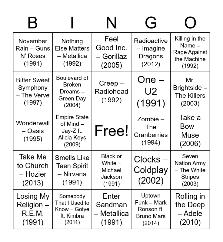 This bingo card has a free space and 25 words: Smells Like Teen Spirit – Nirvana (1991), Enter Sandman – Metallica (1991), Creep – Radiohead (1992), Losing My Religion – R.E.M. (1991), Killing in the Name – Rage Against the Machine (1992), November Rain – Guns N’ Roses (1991), Bitter Sweet Symphony – The Verve (1997), Nothing Else Matters – Metallica (1992), Zombie – The Cranberries (1994), Black or White – Michael Jackson (1991), One – U2 (1991), Wonderwall – Oasis (1995), Clocks – Coldplay (2002), Seven Nation Army – The White Stripes (2003), Boulevard of Broken Dreams – Green Day (2004), In the End – Linkin Park (2000), Take a Bow – Muse (2006), Feel Good Inc. – Gorillaz (2005), Mr. Brightside – The Killers (2003), Empire State of Mind – Jay-Z ft. Alicia Keys (2009), Rolling in the Deep – Adele (2010), Somebody That I Used to Know – Gotye ft. Kimbra (2011), Take Me to Church – Hozier (2013), Radioactive – Imagine Dragons (2012) and Uptown Funk – Mark Ronson ft. Bruno Mars (2014).