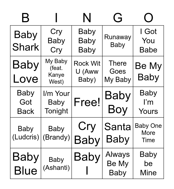 This bingo card has a free space and 28 words: Baby One More Time, Ice Ice Baby, There Goes My Baby, Always Be My Baby, Baby Love, Baby Baby Baby, Cry Baby Cry, Baby (Ludcris), Baby Boy, Baby Blue, Baby Got Back, Runaway Baby, Baby (Ashanti), Baby I, Be My Baby, Baby Don’t Lie, Baby (Brandy), My Baby (feat. Kanye West), Rock Wit U (Aww Baby), Cry Baby, Baby Shark, Give it to Me Baby, Baby be Mine, I/m Your Baby Tonight, Baby I’m Yours, Santa Baby, I Got You Babe and My Baby (Zendaya).