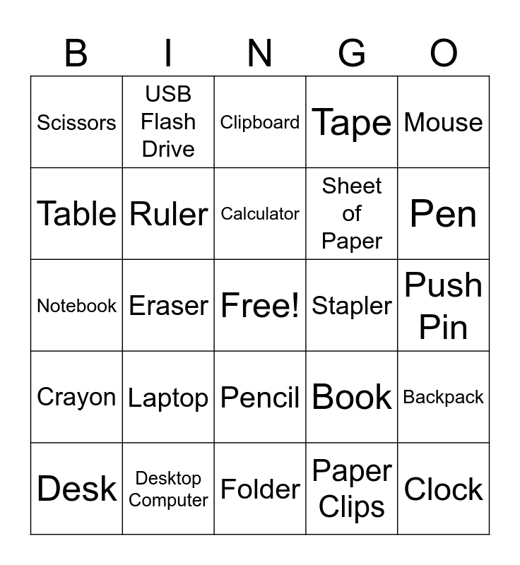 This bingo card has a free space and 30 words: Desktop Computer, Glue, Eraser, Gluestick, Scissors, Clipboard, Ruler, Pencil, Stapler, Folder, Push Pin, Clock, Paper Clips, Pencil Sharpener, Pen, Copier, Book, Crayon, Laptop, Mouse, Notebook, Marker, USB Flash Drive, Sheet of Paper, Table, Tape, Backpack, Desk, Calculator and Sticky Note.