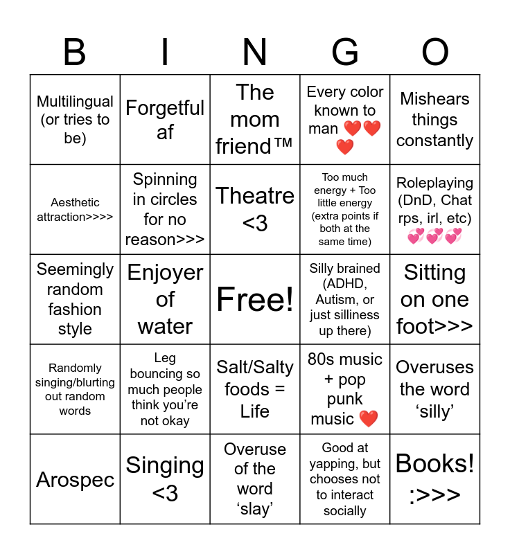 This bingo card has a free space and 24 words: Leg bouncing so much people think you’re not okay, Singing <3, Theatre <3, Arospec, Mishears things constantly, Multilingual (or tries to be), Aesthetic attraction>>>>, Forgetful af, Silly brained (ADHD, Autism, or just silliness up there), Salt/Salty foods = Life, Too much energy + Too little energy (extra points if both at the same time), Seemingly random fashion style, 80s music + pop punk music ❤️, Overuses the word ‘silly’, Spinning in circles for no reason>>>, Good at yapping, but chooses not to interact socially, Sitting on one foot>>>, The mom friend™, Roleplaying (DnD, Chat rps, irl, etc) 💞💞💞, Enjoyer of water, Books! :>>>, Randomly singing/blurting out random words, Every color known to man ❤️❤️❤️ and Overuse of the word ‘slay’.