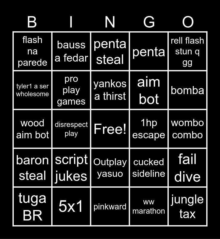This bingo card has a free space and 26 words: Outplay yasuo, ww marathon, yankos a thirst, 5x1, rell flash stun q gg, flash na parede, tyler1 a ser wholesome, bauss a fedar, wombo combo, cucked sideline, aim bot, wood aim bot, fail dive, tuga BR, disrespect play, thirsttrap, penta, baron steal, penta steal, jungle tax, bomba, pinkward, 1hp escape, script jukes, pro play games and streamer inception.