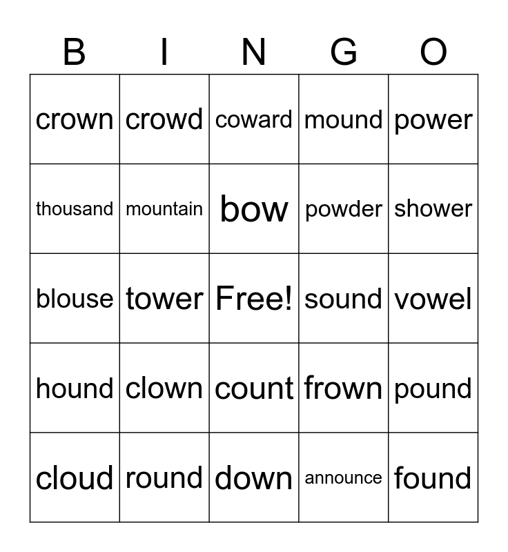 This bingo card has a free space and 24 words: clown, round, bow, cloud, power, crown, thousand, crowd, sound, count, powder, blouse, frown, pound, mountain, announce, vowel, coward, shower, tower, found, hound, mound and down.