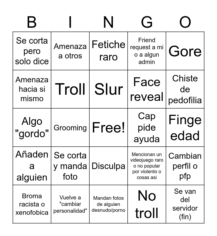 This bingo card has a free space and 24 words: Se corta y manda foto, Vuelve a "cambiar personalidad", Slur, Broma racista o xenofobica, Gore, Se corta pero solo dice, Amenaza hacia si mismo, Amenaza a otros, Cap pide ayuda, Disculpa, Face reveal, Algo "gordo", Mencionan un videojuego raro o no popular por violento o cosas asi, Cambian perfil o pfp, Troll, No troll, Finge edad, Fetiche raro, Chiste de pedofilia, Grooming, Se van del servidor (fin), Añaden a alguien, Friend request a mi o a algun admin and Mandan fotos de alguien desnudo/porno.