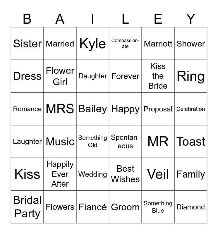 This bingo card has 70 words: Bride, Bailey, Connor, Groom, Spontan-eous, Light Hearted, Compassion-ate, Caring, Marriott, Orlando, Music, Riley, Sister, Kyle, Memorable, Ring, Celebration, Daughter, Friend, Happy, MRS, Laughter, Forever, Wedding, Family, Garter, Honey-moon, Bouquet, Toast, Love, Married, I DO, Couple, Ceremony, Fiancé, Flowers, Candles, Vows, Veil, Shower, Kiss, Proposal, Romance, Wife, Husband, Dress, Something Old, Something Blue, Something Borrowed, Diamond, Gown, The Perfect Day, Best Wishes, Bridal Party, MR, First Dance, Flower Girl, Ring Bearer, Wedding Bells, Happily Ever After, Kiss the Bride, Two Become One, Best Man, Maid of Honor, Just Married, Newly-Weds, Paddle Boarding, Video Games, Cody and Onyx.