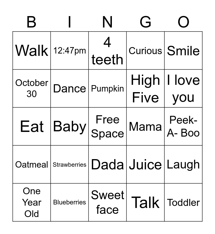 This bingo card has a free space and 24 words: Strawberries, Blueberries, Pumpkin, One Year Old, Smile, Walk, October 30, 12:47pm, Mama, Dada, High Five, Eat, Juice, Laugh, Dance, Talk, Peek-A- Boo, 4 teeth, I love you, Baby, Toddler, Oatmeal, Curious and Sweet face.