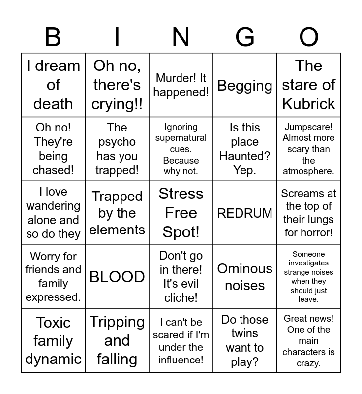 This bingo card has a free space and 24 words: BLOOD, Tripping and falling, Ignoring supernatural cues. Because why not., Toxic family dynamic, The stare of Kubrick, I dream of death, Oh no! They're being chased!, Oh no, there's crying!!, REDRUM, Don't go in there! It's evil cliche!, Is this place Haunted? Yep., I love wandering alone and so do they, Ominous noises, Someone investigates strange noises when they should just leave., The psycho has you trapped!, Do those twins want to play?, Screams at the top of their lungs for horror!, Murder! It happened!, Jumpscare! Almost more scary than the atmosphere., Trapped by the elements, Great news! One of the main characters is crazy., Worry for friends and family expressed., Begging and I can't be scared if I'm under the influence!.