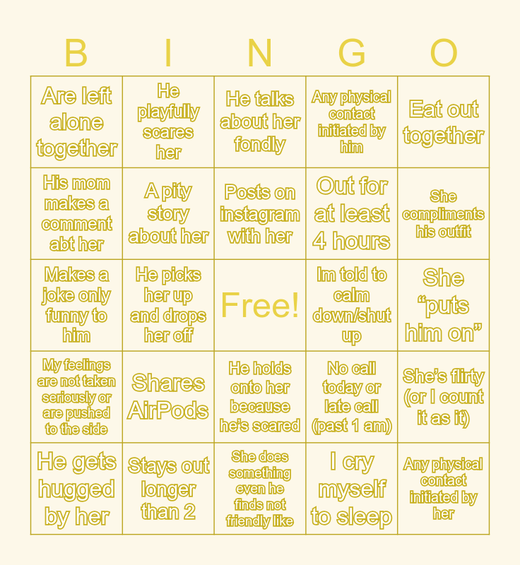 This bingo card has a free space and 24 words: Shares AirPods, Stays out longer than 2, Posts on instagram with her, He gets hugged by her, Eat out together, Are left alone together, His mom makes a comment abt her, He playfully scares her, Im told to calm down/shut up, He holds onto her because he’s scared, Out for at least 4 hours, Makes a joke only funny to him, No call today or late call (past 1 am), She’s flirty (or I count it as it), A pity story about her, I cry myself to sleep, She “puts him on”, He talks about her fondly, She compliments his outfit, He picks her up and drops her off, Any physical contact initiated by her, My feelings are not taken seriously or are pushed to the side, Any physical contact initiated by him and She does something even he finds not friendly like.