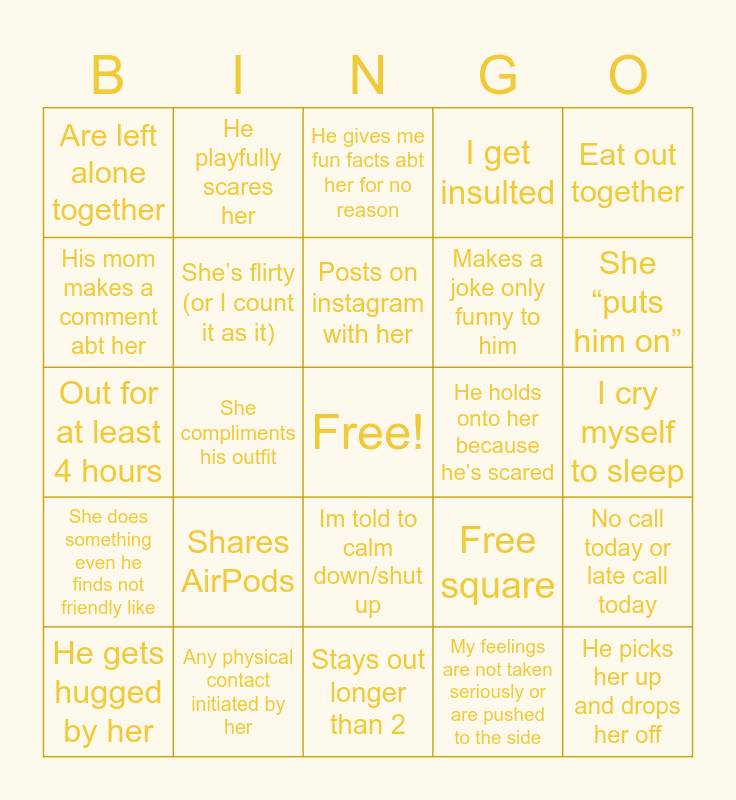 This bingo card has a free space and 25 words: Shares AirPods, Stays out longer than 2, Posts on instagram with her, He gets hugged by her, Eat out together, Are left alone together, His mom makes a comment abt her, He playfully scares her, He holds onto her because he’s scared, Im told to calm down/shut up, Makes a joke only funny to him, Out for at least 4 hours, Free square, No call today or late call today, She’s flirty (or I count it as it), A pity story about her, I cry myself to sleep, He gives me fun facts abt her for no reason, She “puts him on”, She compliments his outfit, He picks her up and drops her off, Any physical contact initiated by her, She does something even he finds not friendly like, I get insulted and My feelings are not taken seriously or are pushed to the side.