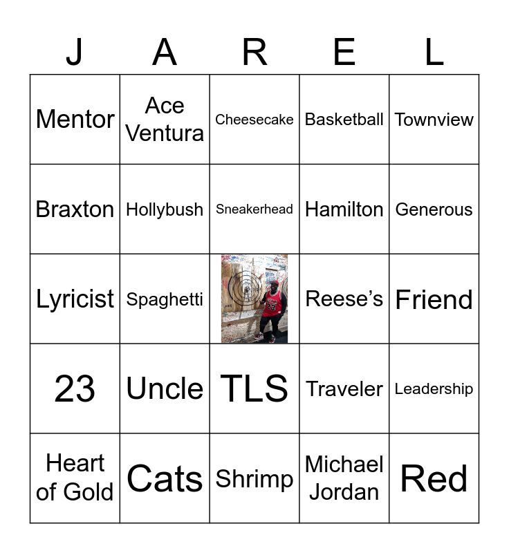 This bingo card has a free space and 32 words: Michael Jordan, DC, Spaghetti, Mumbo Sauce, 23, Hollybush, Townview, Leadership, Ace Ventura, Warrior, Sneakerhead, Cheesecake, Akari, The Bible, Reese’s, Comedian, Heart of Gold, Lyricist, TLS, Uncle, Traveler, Man of God, Friend, Cats, Red, Basketball, Hamilton, Braxton, Mentor, Shrimp, Mathematician and Generous.