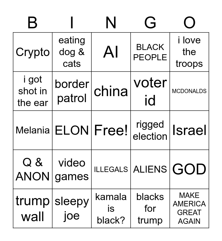 This bingo card has a free space and 24 words: trump wall, video games, china, blacks for trump, i love the troops, Crypto, eating dog & cats, AI, rigged election, Israel, Melania, border patrol, ALIENS, GOD, i got shot in the ear, sleepy joe, kamala is black?, BLACK PEOPLE, MCDONALDS, Q & ANON, ELON, ILLEGALS, voter id and MAKE AMERICA GREAT AGAIN.
