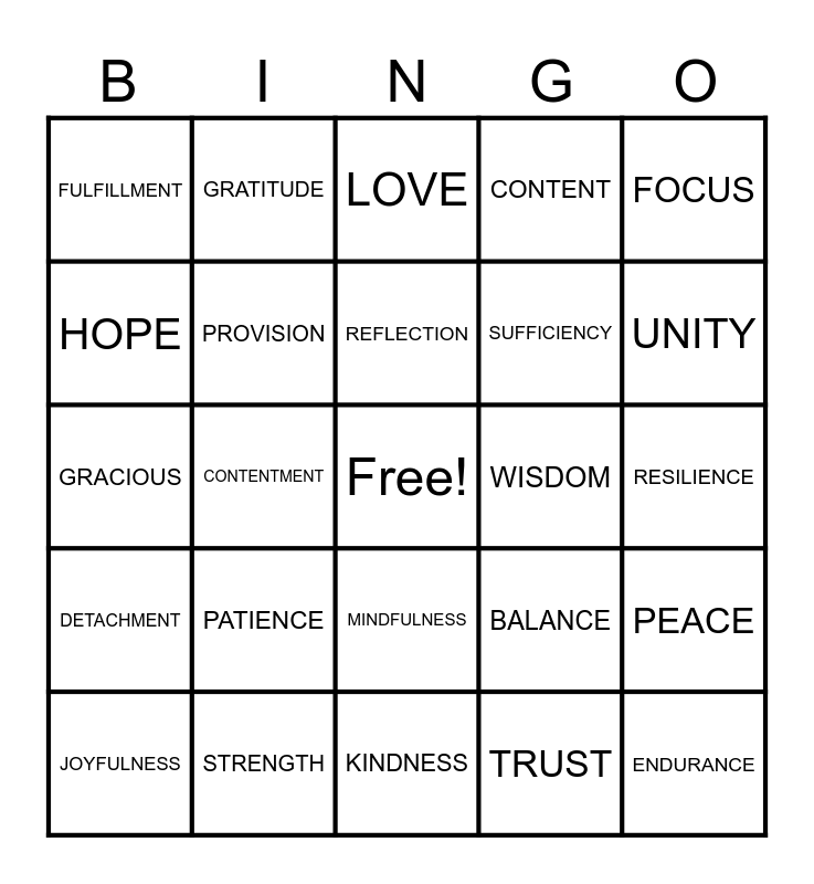 This bingo card has a free space and 50 words: CONTENTMENT, STRENGTH, GRACE, TRUST, PEACE, JOY, GRATITUDE, ABUNDANCE, SUFFICIENCY, FAITH, HOPE, PROVISION, BALANCE, ENDURANCE, COURAGE, COMFORT, LOVE, WISDOM, SIMPLICITY, FULFILLMENT, PATIENCE, KINDNESS, CONTENT, UNITY, SERVICE, FELLOWSHIP, REFLECTION, PURPOSE, FOCUS, DETACHMENT, FREEDOM, SUBMISSION, SACRIFICE, CLARITY, CONTENTEDNESS, EMPATHY, COMMUNITY, GRACIOUSNESS, RESTORATION, GRACIOUS, SURRENDER, PERSEVERANCE, SELF-CONTROL, ENLIGHTENMENT, JOYFULNESS, CONTENTMENT, MINDFULNESS, REFLECTION, RESILIENCE and HOPEFULNESS.