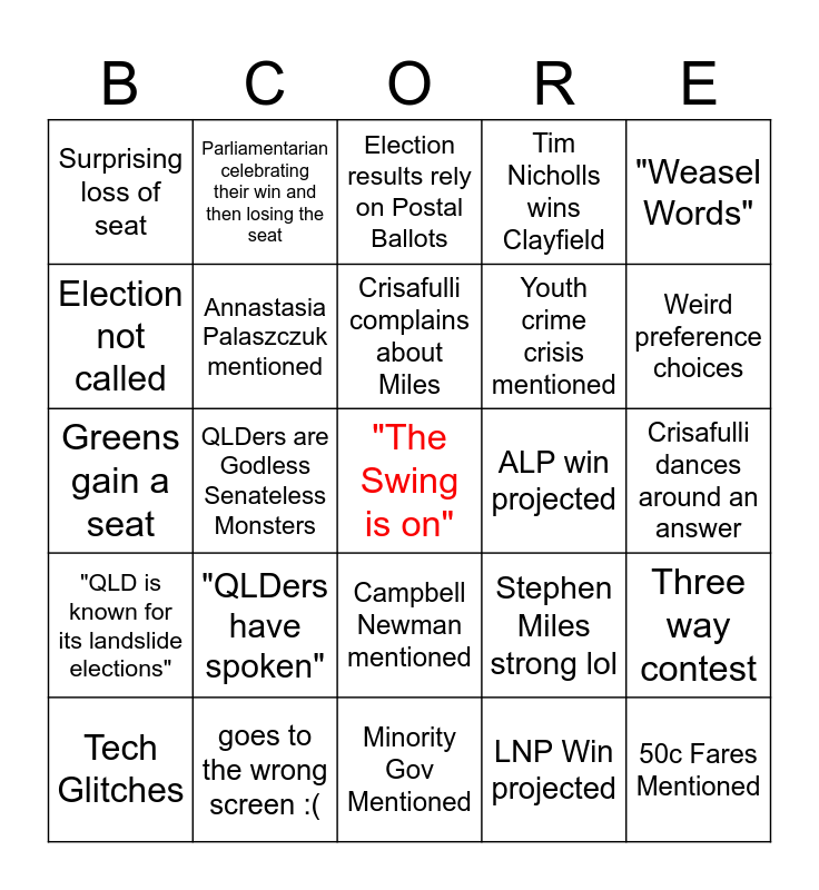 This bingo card has a free space and 24 words: "QLDers have spoken", goes to the wrong screen :(, Crisafulli complains about Miles, Tech Glitches, "Weasel Words", Surprising loss of seat, Election not called, Parliamentarian celebrating their win and then losing the seat, ALP win projected, Campbell Newman mentioned, Youth crime crisis mentioned, Greens gain a seat, Stephen Miles strong lol, Three way contest, Annastasia Palaszczuk mentioned, LNP Win projected, Crisafulli dances around an answer, Election results rely on Postal Ballots, Weird preference choices, QLDers are Godless Senateless Monsters, 50c Fares Mentioned, "QLD is known for its landslide elections", Tim Nicholls wins Clayfield and Minority Gov Mentioned.