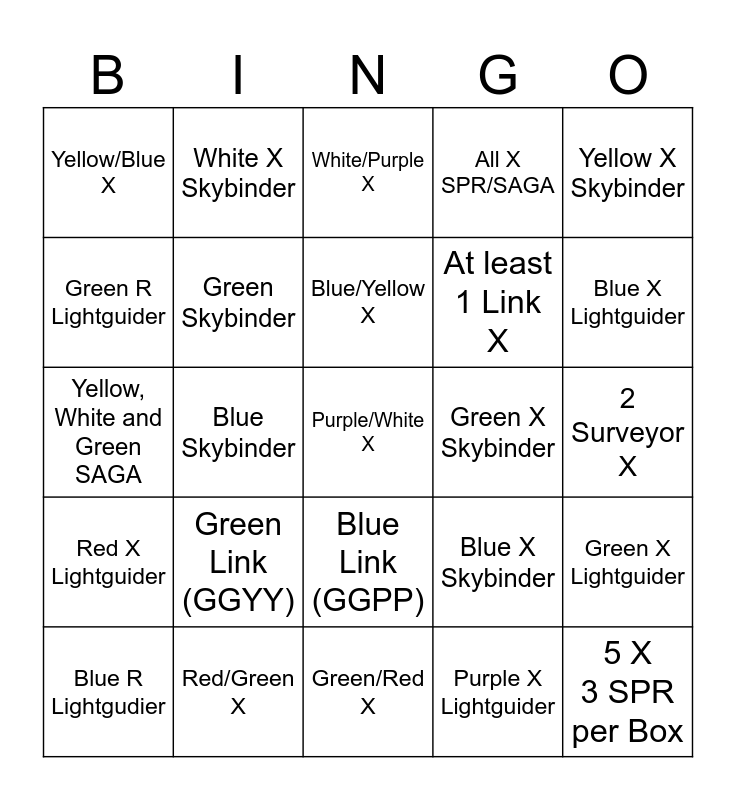 This bingo card has 25 words: Red X Lightguider, Red/Green X, Purple/White X, Purple X Lightguider, Yellow X Skybinder, Yellow/Blue X, White X Skybinder, White/Purple X, Green X Skybinder, Green X Lightguider, Green R Lightguider, Green Skybinder, Green/Red X, Blue X Skybinder, Blue X Lightguider, Blue R Lightgudier, Blue Skybinder, Blue/Yellow X, At least 1 Link X, 2 Surveyor X, Yellow, White and Green SAGA, Green Link (GGYY), Blue Link (GGPP), All X SPR/SAGA and 5 X 3 SPR per Box.