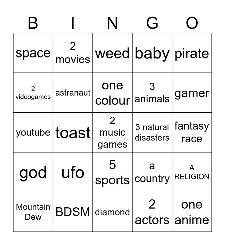 This bingo card has a free space and 24 words: ufo, BDSM, one colour, Mountain Dew, pirate, space, 2 videogames, 2 movies, 3 natural disasters, 5 sports, 3 animals, youtube, a country, A RELIGION, astranaut, 2 actors, fantasy race, weed, gamer, toast, one anime, god, baby and diamond.