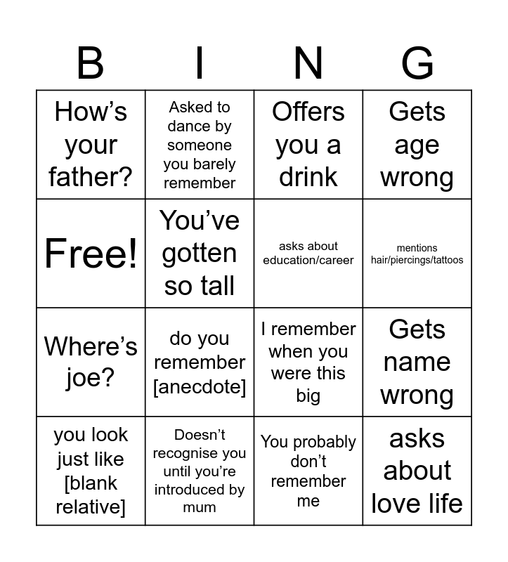 This bingo card has 16 words: Doesn’t recognise you until you’re introduced by mum, Gets name wrong, Offers you a drink, How’s your father?, Where’s joe?, Asked to dance by someone you barely remember, I remember when you were this big, You probably don’t remember me, Free!, You’ve gotten so tall, you look just like [blank relative], Gets age wrong, do you remember [anecdote], mentions hair/piercings/tattoos, asks about education/career and asks about love life.