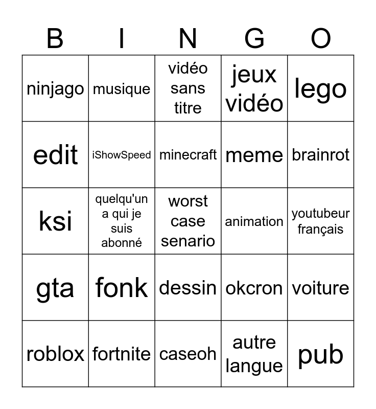 This bingo card has a free space and 24 words: fonk, fortnite, minecraft, roblox, lego, ninjago, edit, musique, animation, dessin, meme, ksi, okcron, voiture, iShowSpeed, autre langue, youtubeur français, vidéo sans titre, brainrot, quelqu'un a qui je suis abonné, pub, gta, jeux vidéo and caseoh.