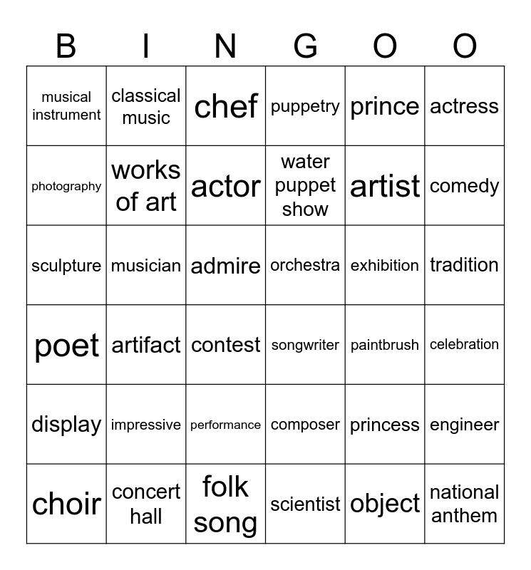 This bingo card has 36 words: composer, performance, scientist, photography, poet, orchestra, works of art, folk song, prince, princess, comedy, puppetry, engineer, musician, water puppet show, musical instrument, display, exhibition, sculpture, chef, admire, artifact, songwriter, contest, paintbrush, classical music, artist, concert hall, actor, actress, national anthem, choir, celebration, tradition, impressive and object.
