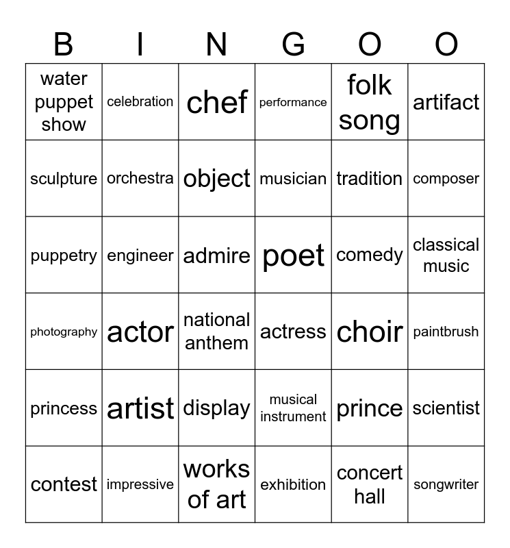 This bingo card has 36 words: musical instrument, display, exhibition, sculpture, photography, poet, orchestra, works of art, folk song, prince, composer, performance, scientist, engineer, musician, water puppet show, princess, comedy, puppetry, chef, admire, actor, actress, national anthem, choir, celebration, tradition, impressive, object, artifact, songwriter, contest, paintbrush, classical music, artist and concert hall.