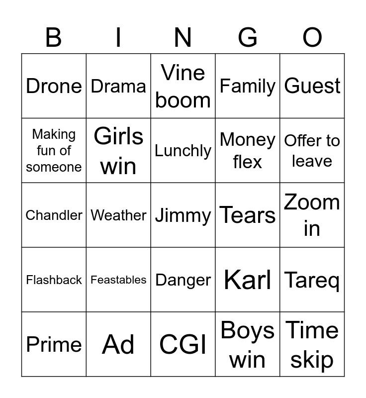 This bingo card has a free space and 24 words: Feastables, Ad, Lunchly, Prime, Guest, Drone, Making fun of someone, Drama, Tears, Danger, Money flex, Chandler, Karl, Tareq, Girls win, Boys win, Zoom in, Vine boom, Offer to leave, Weather, Time skip, Flashback, Family and CGI.