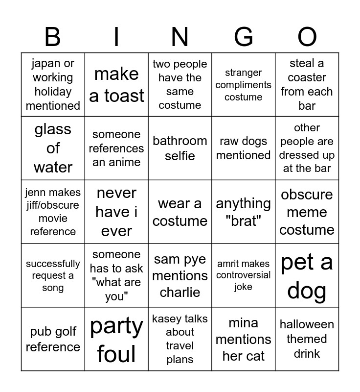 This bingo card has a free space and 38 words: new ig follow from someone in the group, win a round of apateu, play picolo, someone references an anime, pet a dog, someone has to ask "what are you", bathroom selfie, yap sesh w someone new, steal a coaster from each bar, raw dogs mentioned, never have i ever, stranger compliments costume, halloween themed drink, obscure meme costume, glass of water, successfully request a song, stranger asks what our deal is, two people have the same costume, take a group candid, anything "brat", japan or working holiday mentioned, party foul, other people are dressed up at the bar, pub golf reference, nina stays for longer than an hour, kasey talks about travel plans, mitchell does a kpop/tiktok dance, jasmeen suggests fries for the table, brooke and megan interrupt each other, lauren says yippee, sammi laugh-cries, sam pye mentions charlie, mina mentions her cat, make a toast, nick is having the "best day of his life", amrit makes controversial joke, jenn makes jiff/obscure movie reference and mara and pickles.